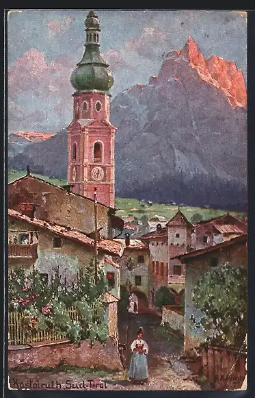 Künstler-AK Rud.A. Höger: Kastelruth, Ortsansicht, Wegpartie
