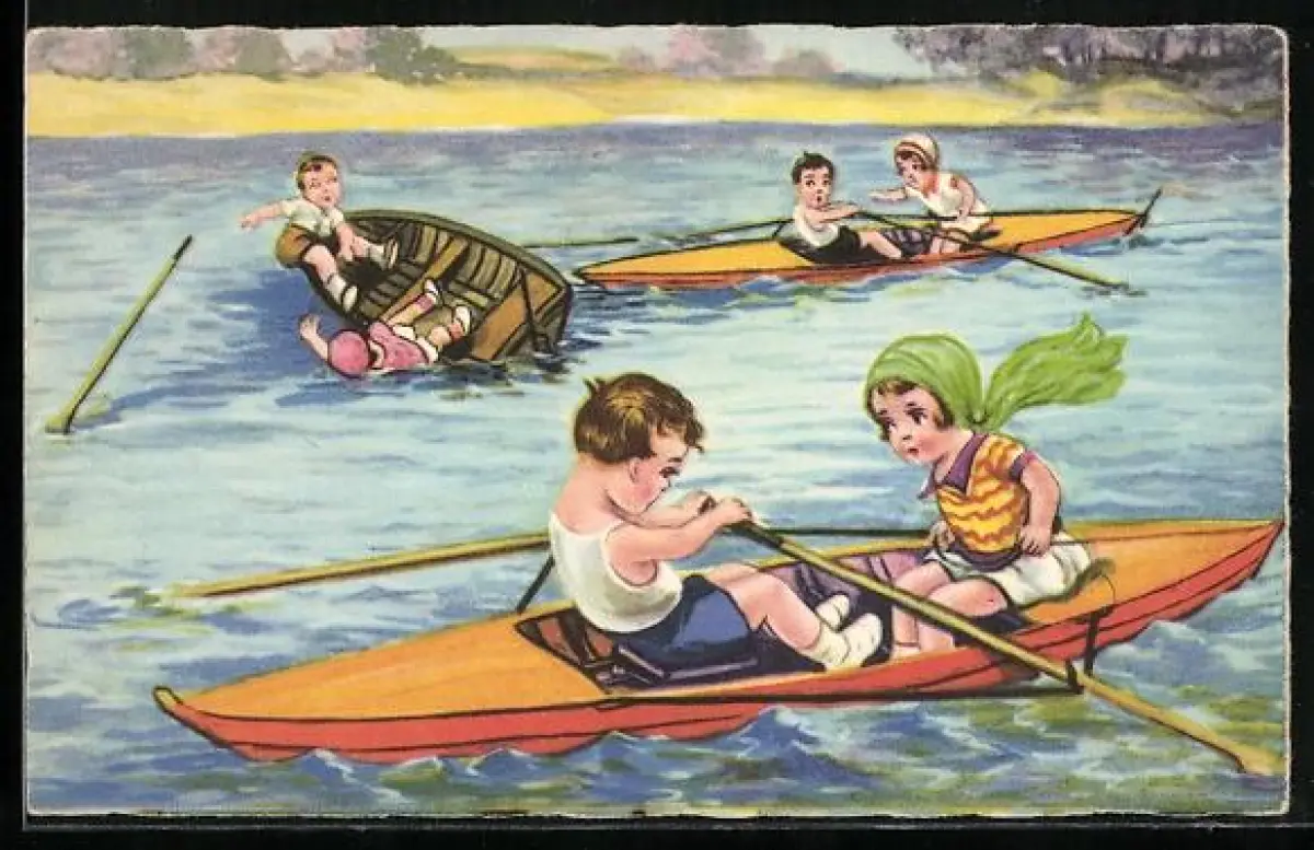 Künstler-AK Ruderboote auf einem See, Zwei Kinder fallen aus ihrem Boot