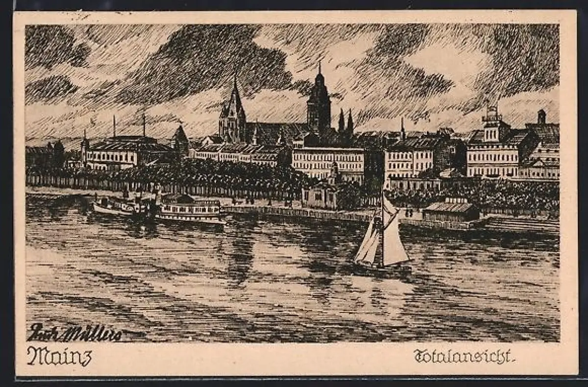 Künstler-AK Rudi Müller: Mainz, Flusspartie mit Booten