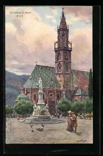 Künstler-AK Rudolf Alfred Höger: Bozen, Pfarrkirche mit Denkmal