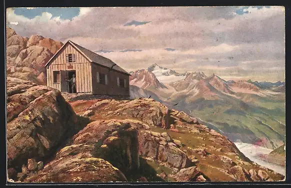 Künstler-AK Rudolf Reschreiter: Rauhekopfhütte, Bergpanorama
