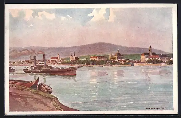 Künstler-AK Rudolf Schmidt: Vácz, Panorama mit Raddampfer