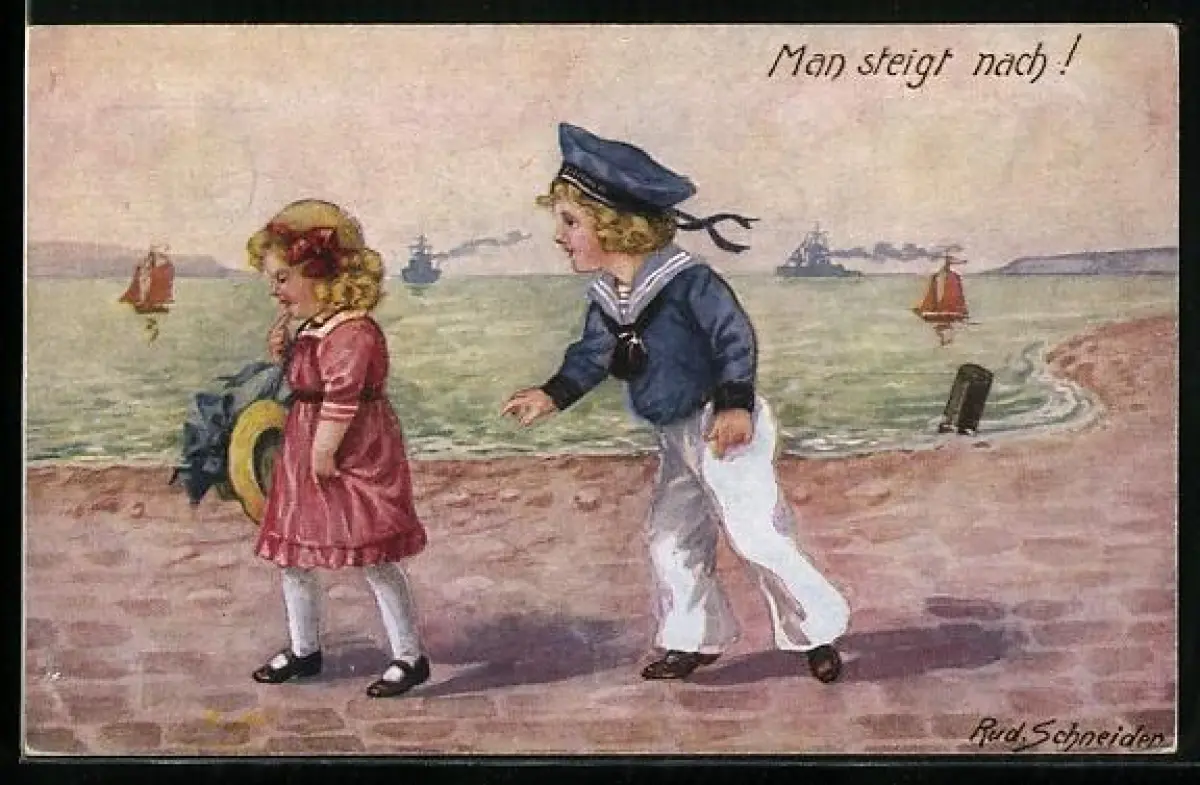 Künstler-AK Rudolf Schneider: Kleiner Matrose schaut einem Mädchen hinterher