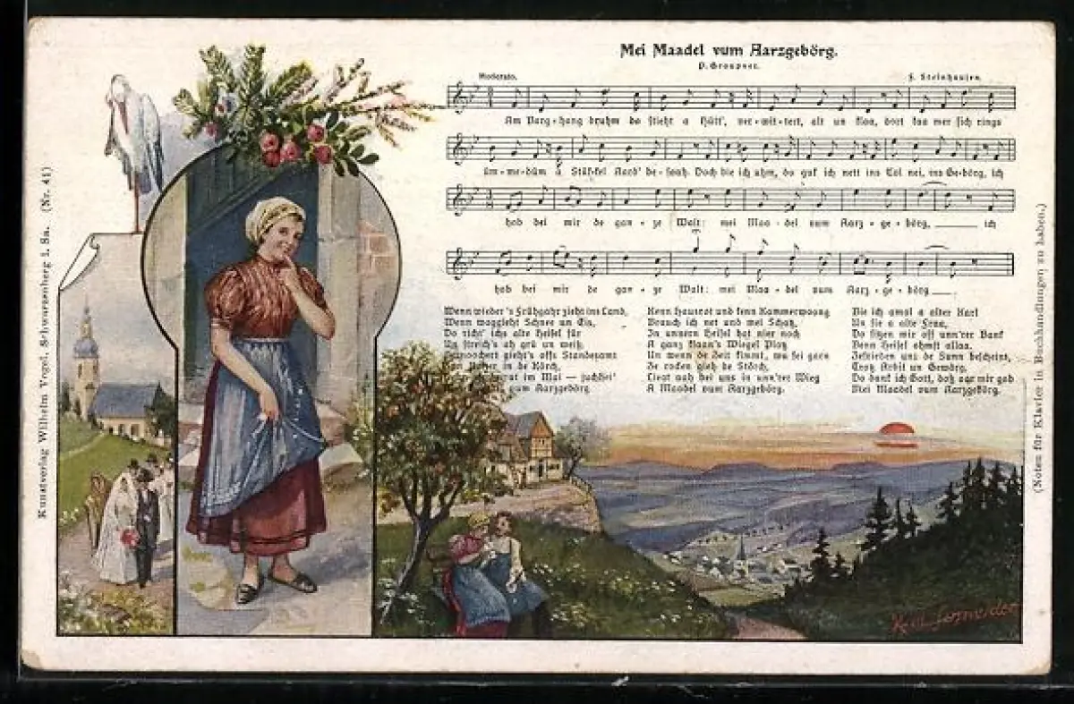 Künstler-AK Rudolf Schneider: Mei Maadel vum Aarzgebörg, schüchternes Mädchen, Storch, Hochzeit, Lied