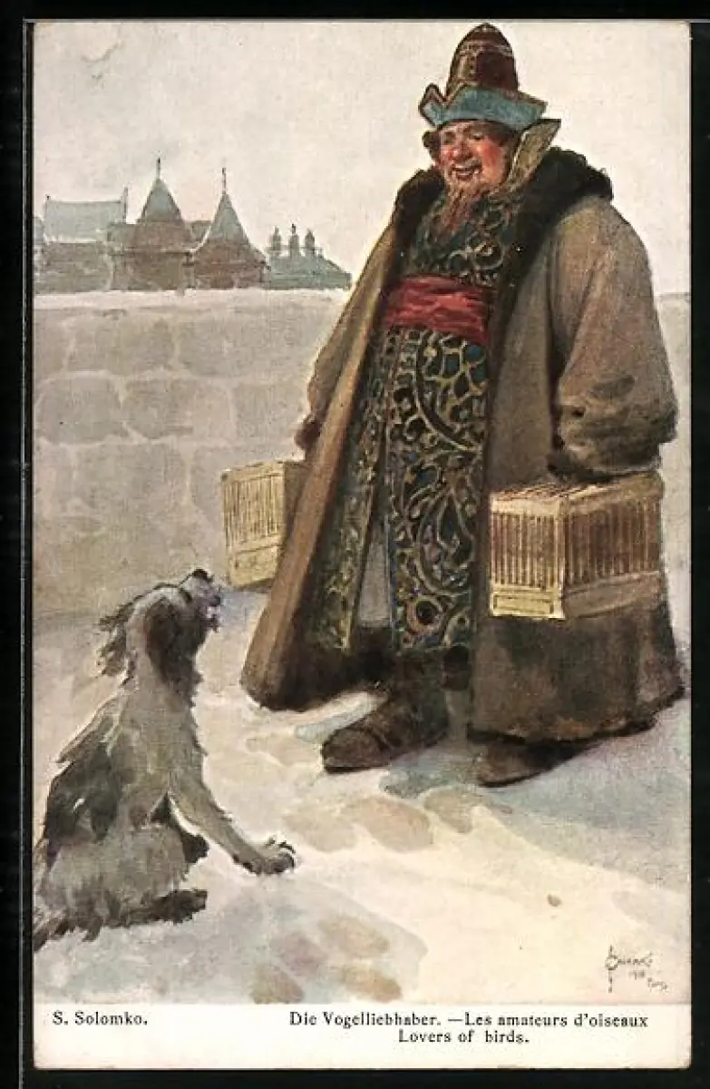 Künstler-AK S. Solomko: Mann mit Vogelkäfig in der Hand, Vogelliebhaber