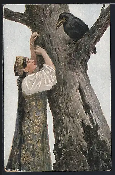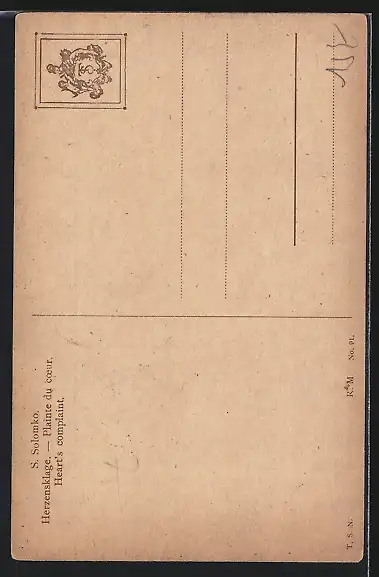 Künstler-AK S.Solomko: Herzensklage, junge Frau mit Rabe