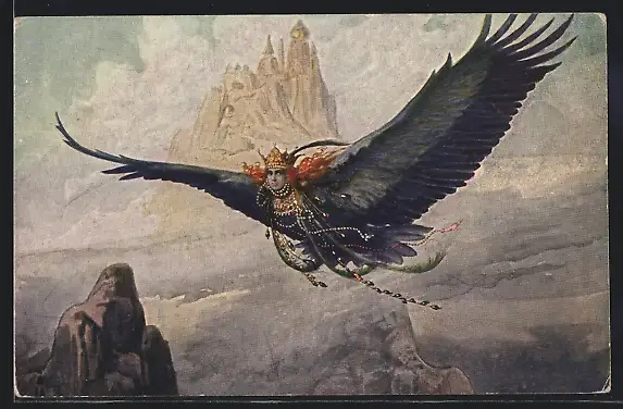 Künstler-AK S.Solomko: die Phantasie, Adler mit einem Frauenkopf fliegt über felsige Landschaft