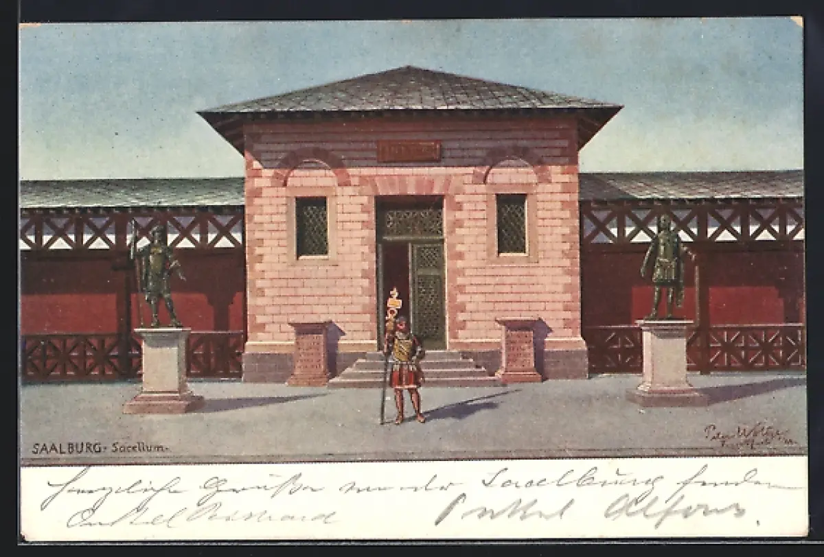 Künstler-AK Saalburg, römischer Legionär vor dem Sacellum