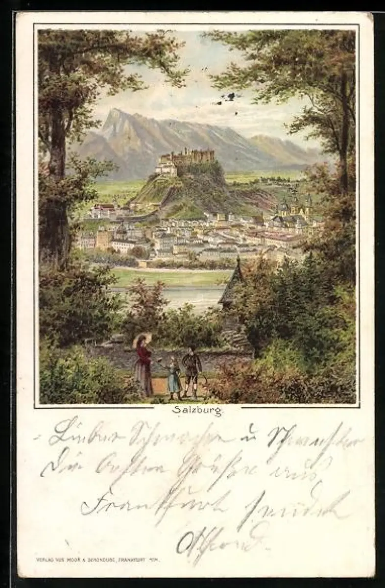 Künstler-AK Salzburg, Blick von einer Anhöhe auf die Stadt