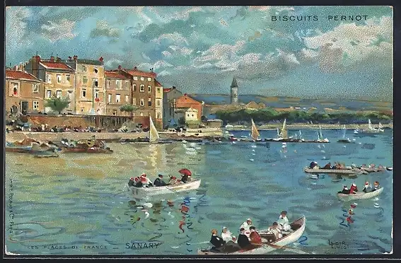 Künstler-AK Sanary, Scène animée de bateaux sur le port avec vue sur les maisons