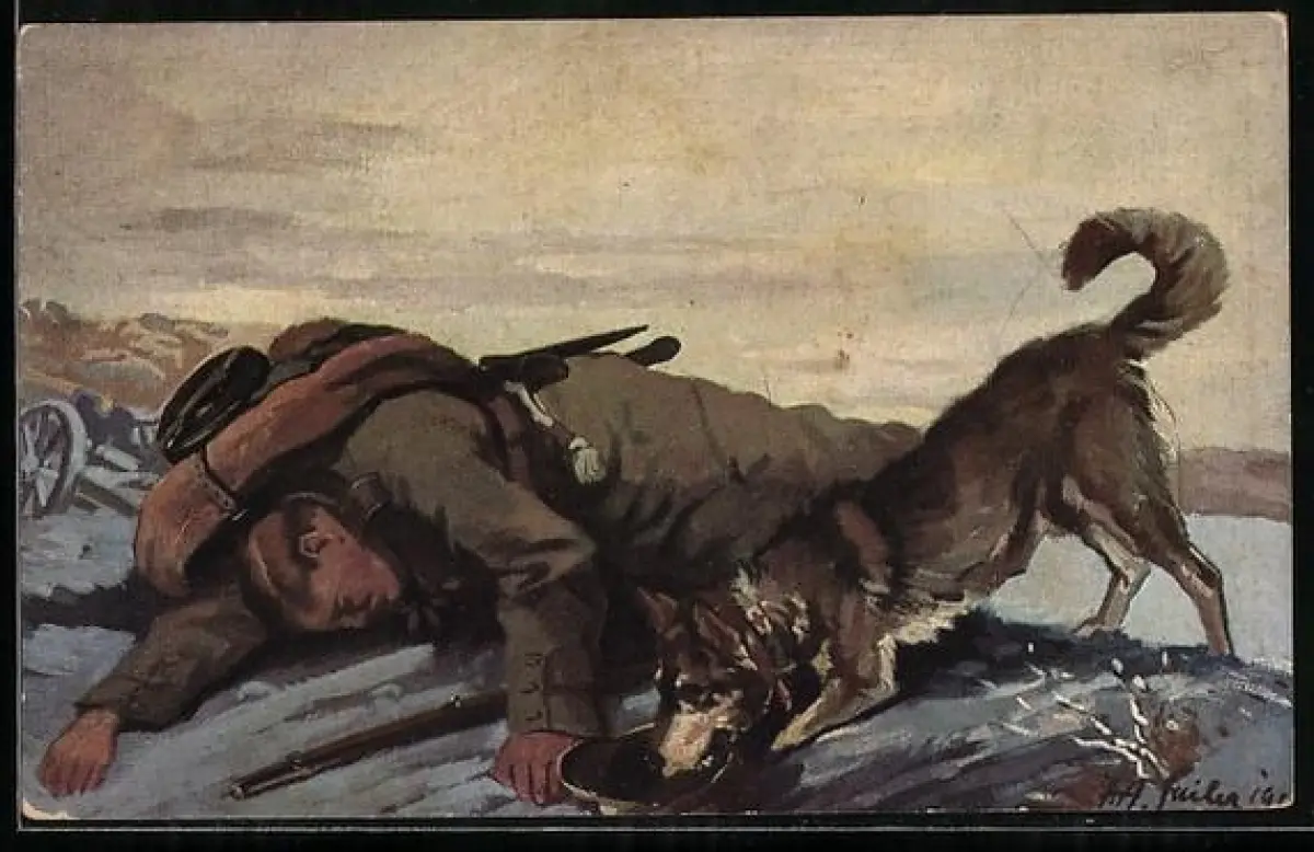 Künstler-AK Sanitätshund findet einen verwundeten Soldaten