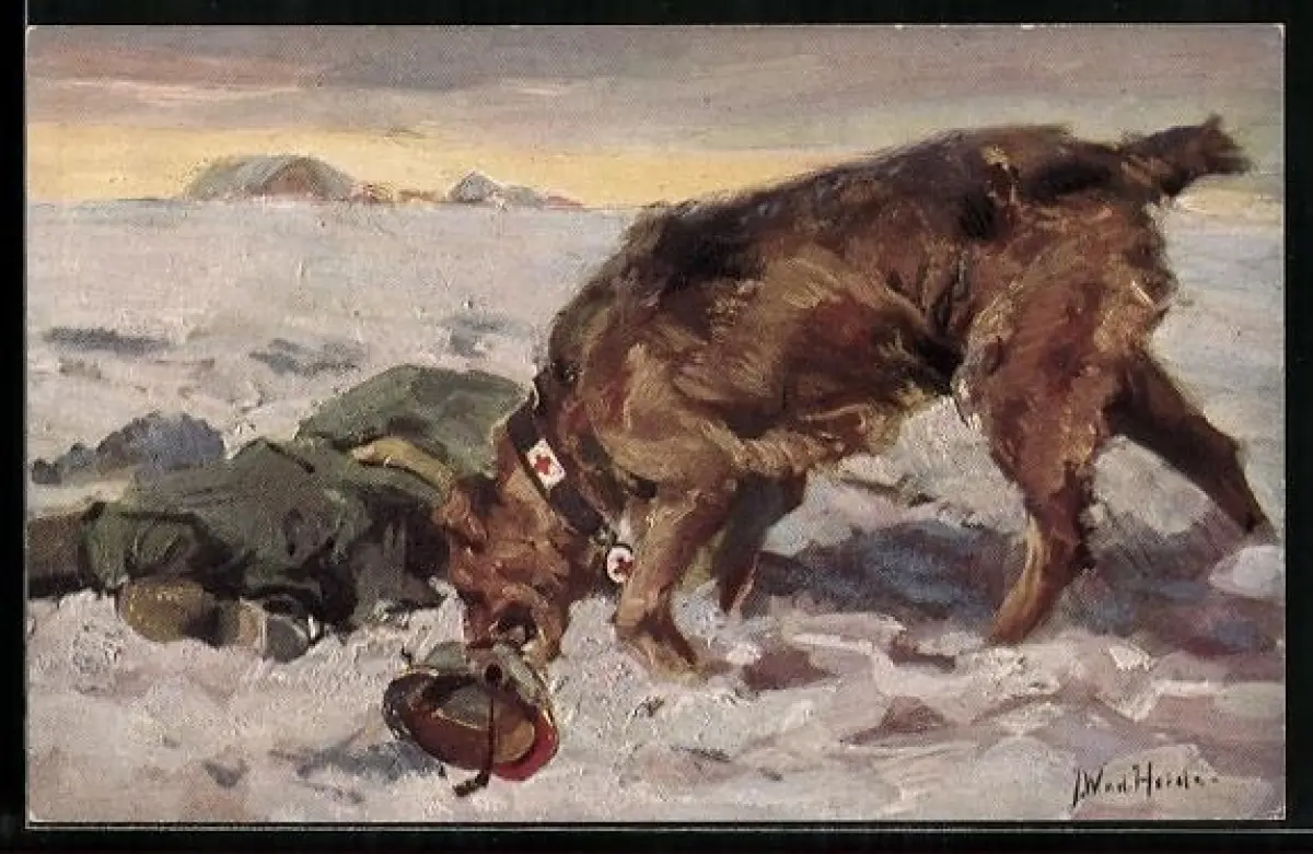 Künstler-AK Sanitätshund findet verwundeten Soldaten