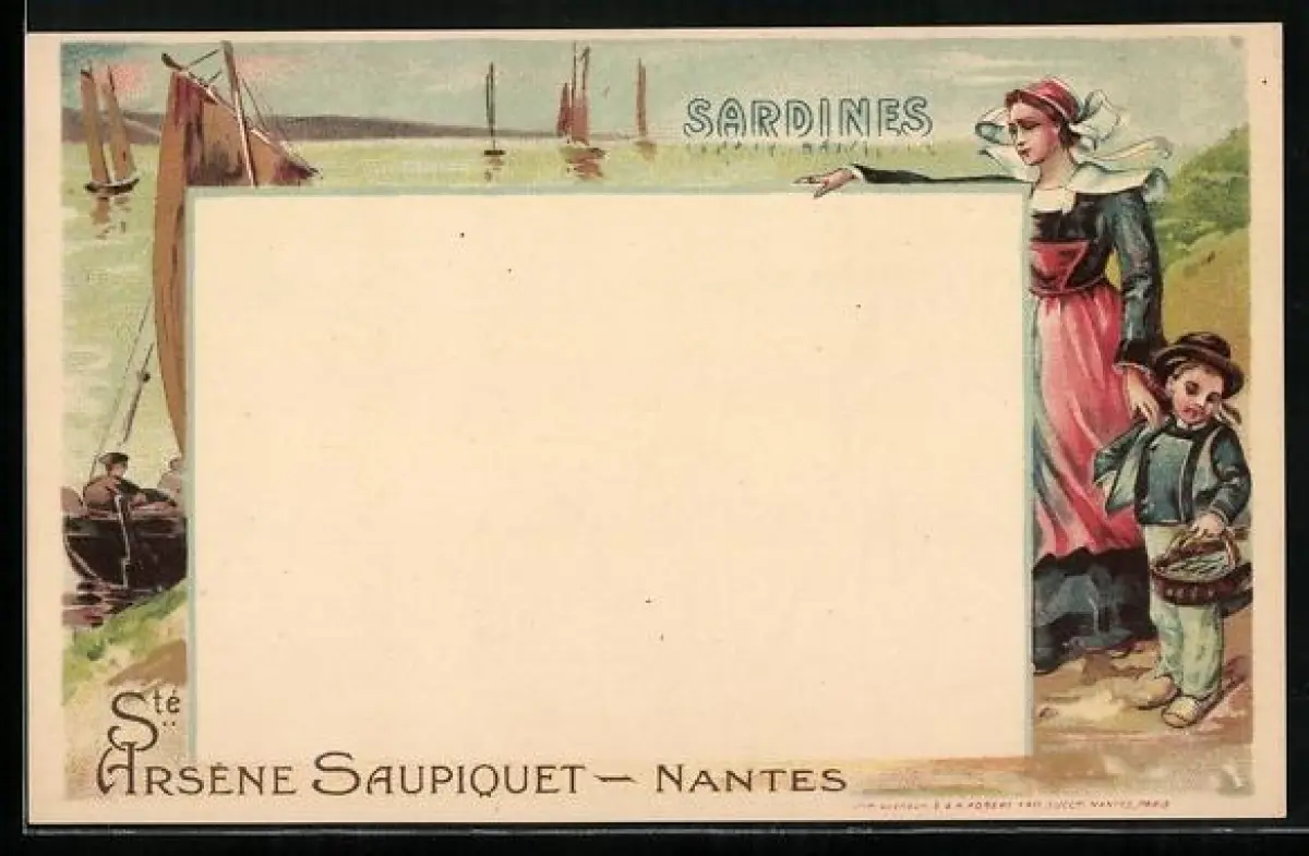 Künstler-AK Sardines, Ste Arsène Saupiquet, Dame mit ihrem Sohn am Wasser