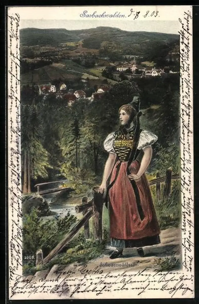 Künstler-AK Sasbachwalden, Blick vom Berg auf den Ort, Fräulein im Trachtenkleid