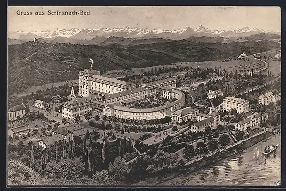 Künstler-AK Schinznach-Bad, Teilansicht mit Umgebung aus der Vogelschau