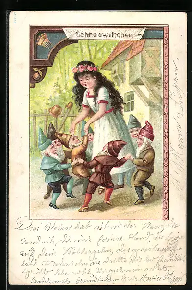 Künstler-AK Schneewittchen tanzt mit ihren Zwergen