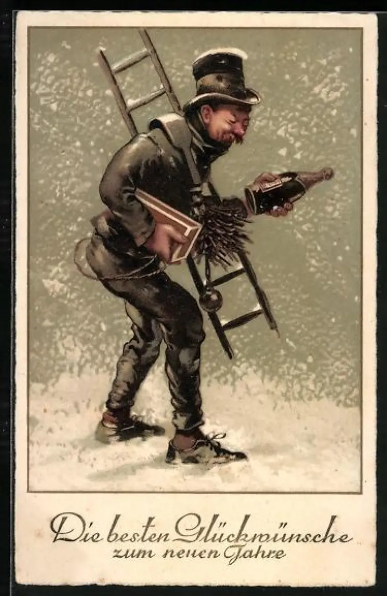 Künstler-AK Schornsteinfeger mit einer Flasche Wein im Schnee, Neujahr