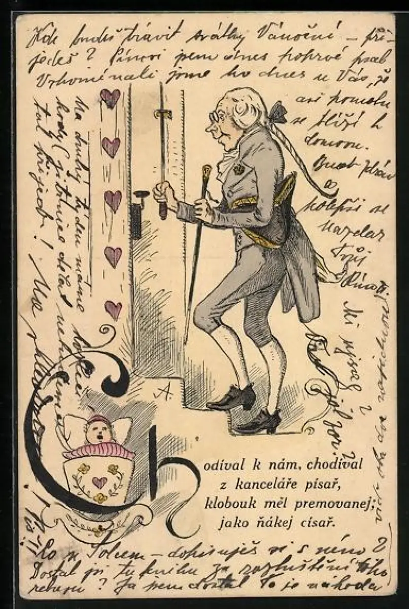 Künstler-AK Schreiber mit Dreispitz an der Türklingel, Kleinkind in Wiegenbett