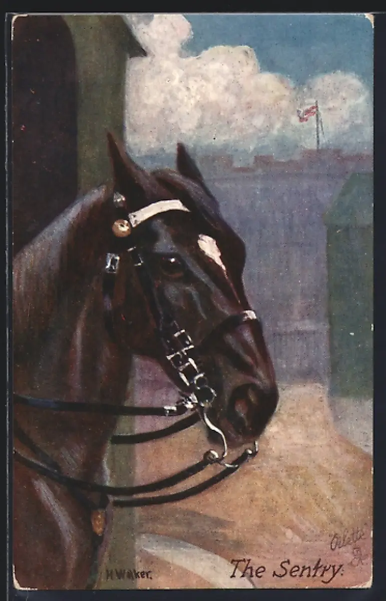 Künstler-AK Schwarzes Pferd mit Zaumzeug, The Sentry