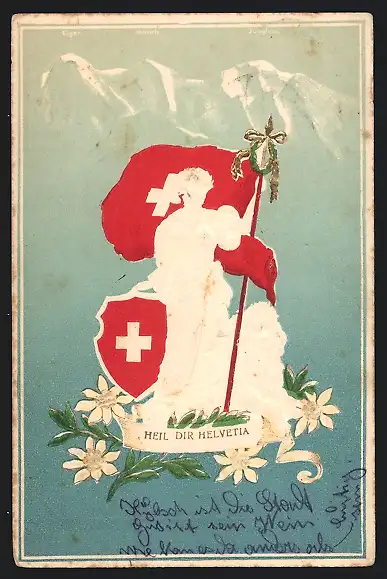 Künstler-AK Schweiz, A Toi, Patrie!, Helvetia mit Wappen, Edelweiss