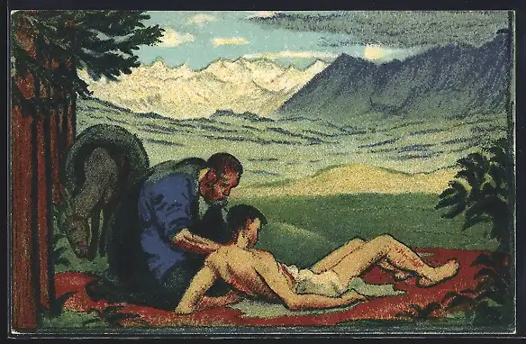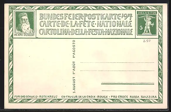 Künstler-AK Schweiz, Bundesfeier 1917, Mann hilft einem Verwundeten, Schweiz. Rotes Kreuz