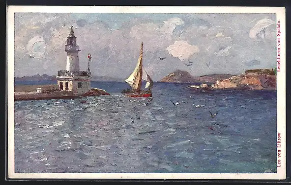 Künstler-AK Segelboot vor Mole und Leuchtturm