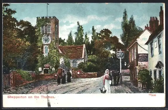 Künstler-AK Shepperton on the Thames, Strassenpartie mit Turm und King`s Head Pub