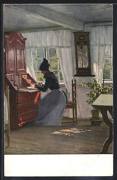 Künstler-AK Sigvard Hansen: Frau in Tracht schreibt einen Brief am Schreibtisch