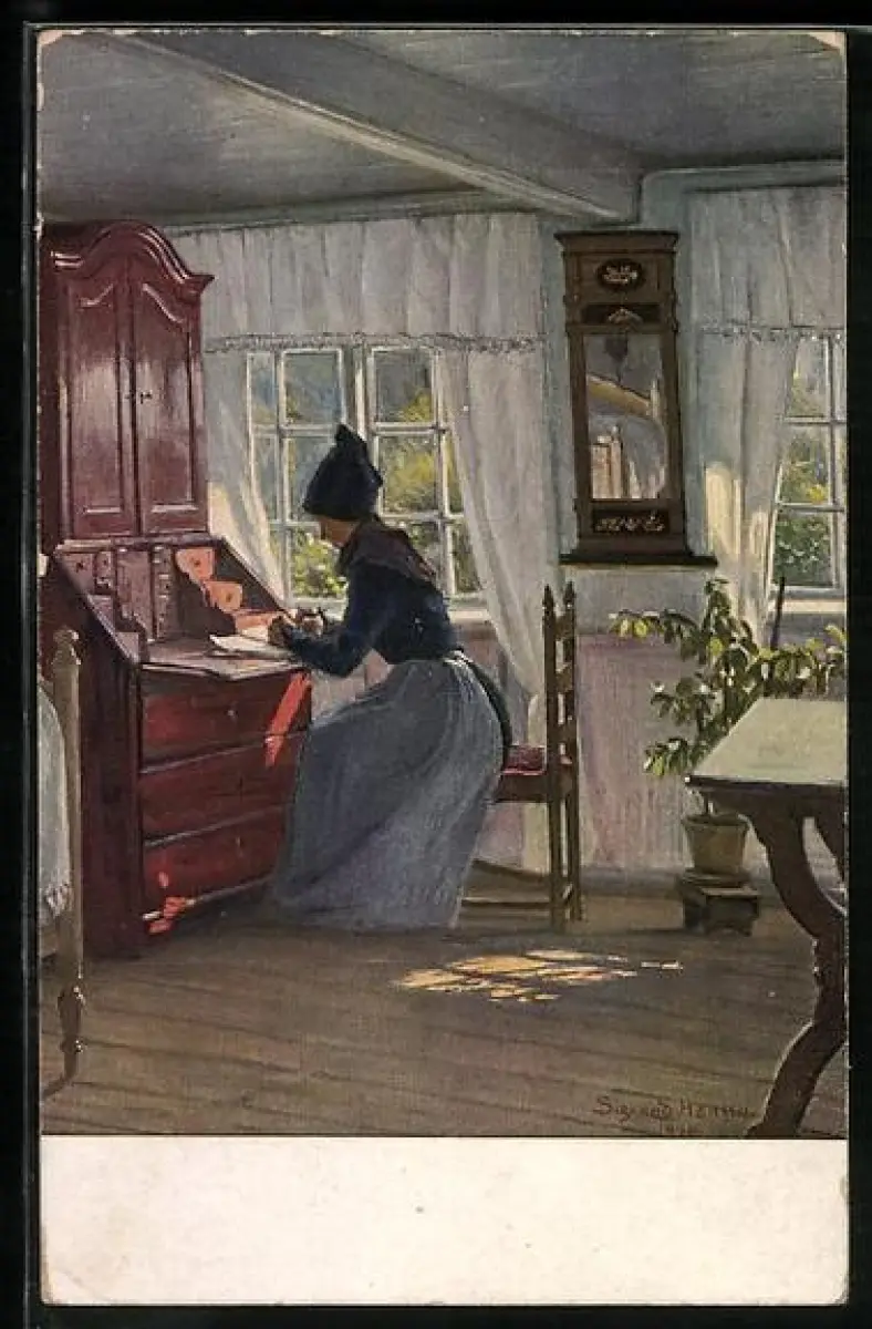 Künstler-AK Sigvard Hansen: Frau in Tracht schreibt einen Brief am Schreibtisch