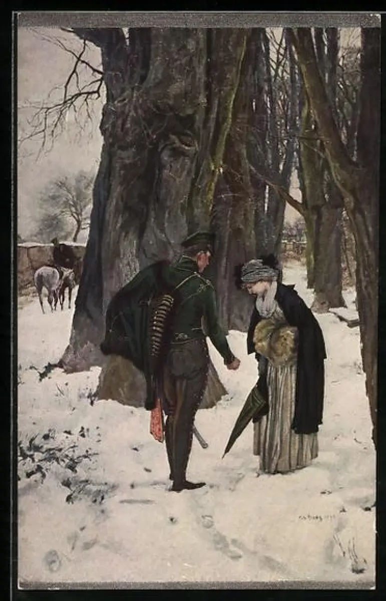 Künstler-AK Soldat der Kavallerie neben Dame im Schnee