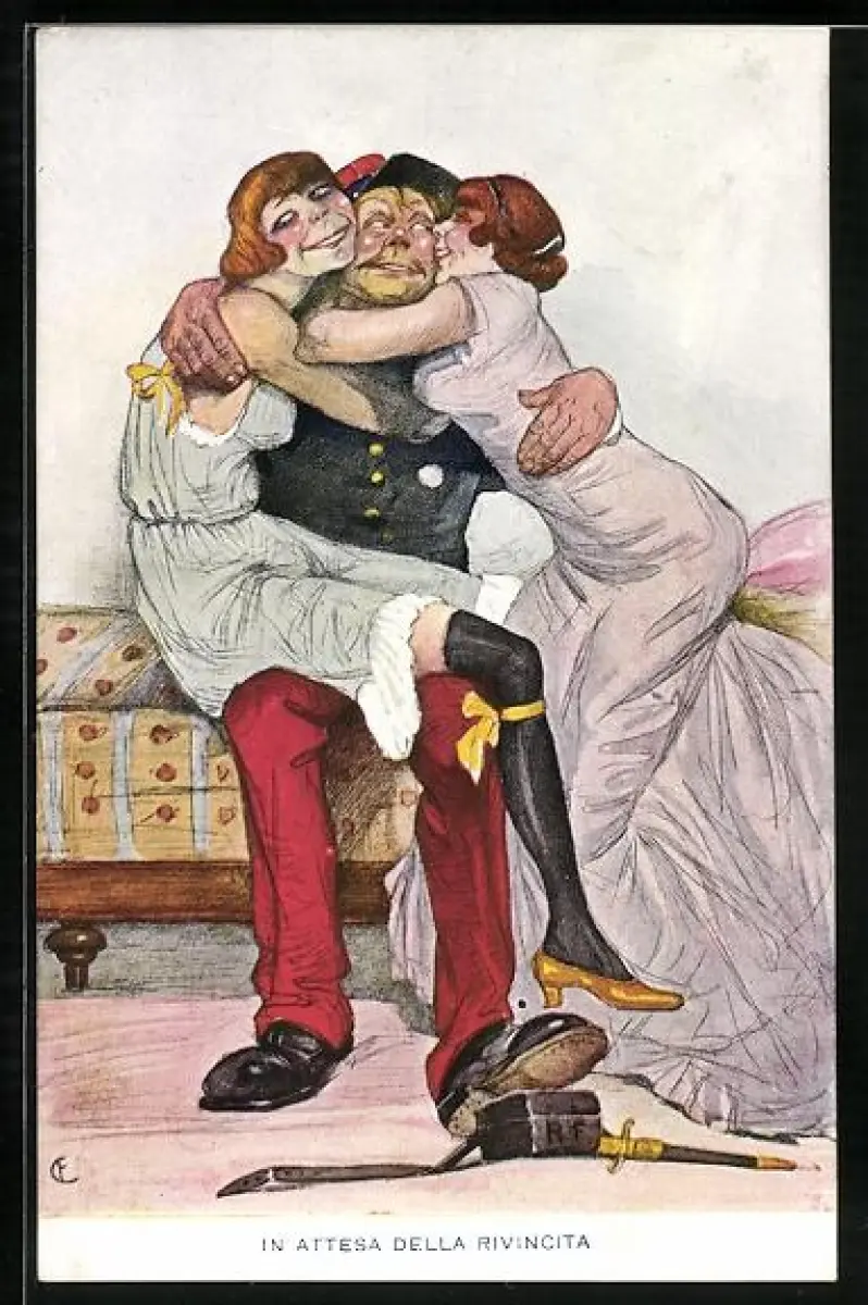 Künstler-AK Soldat mit zwei jungen Damen im Arm