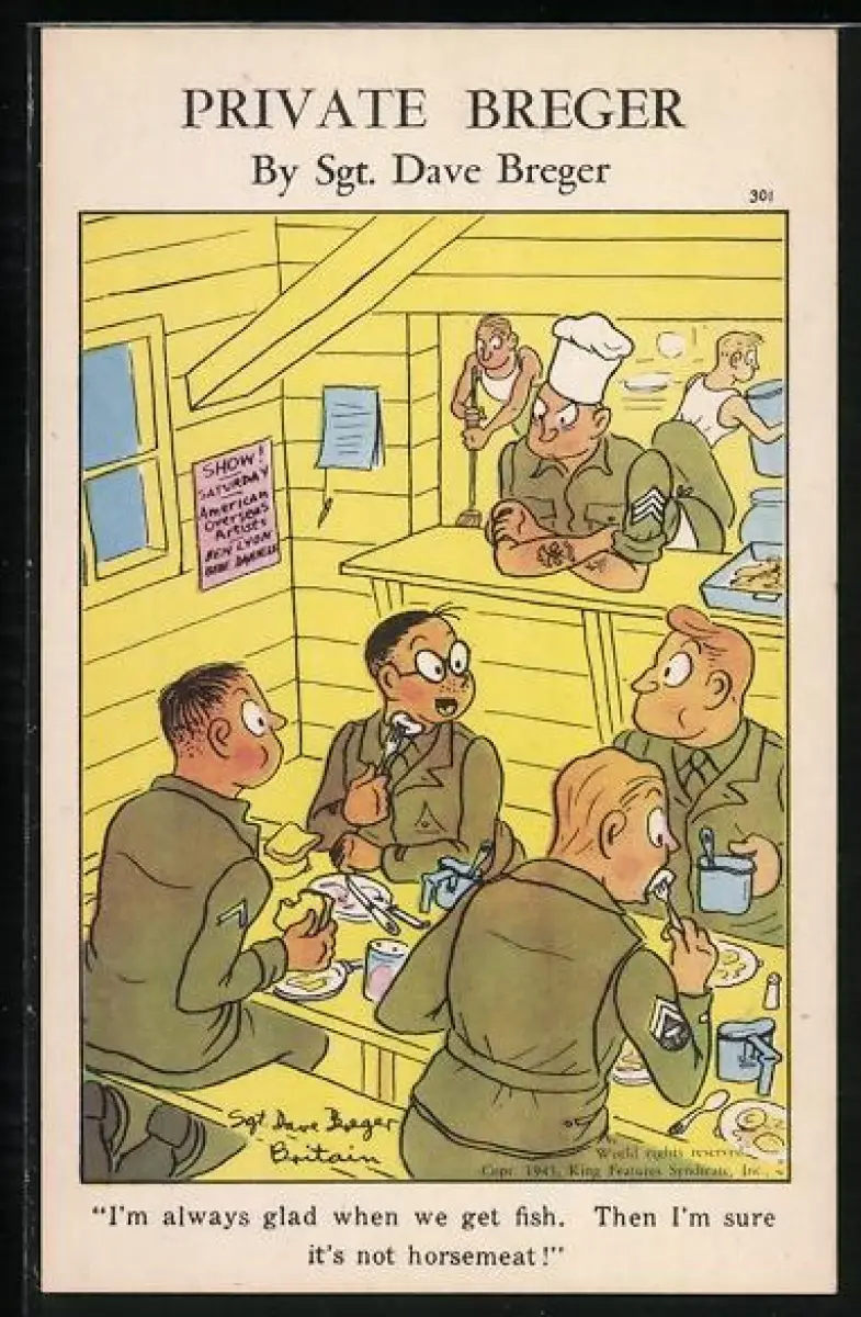 Künstler-AK Soldaten beim Essen, I`m always glad when we get fish. Then I`m sure its not horsemeat!