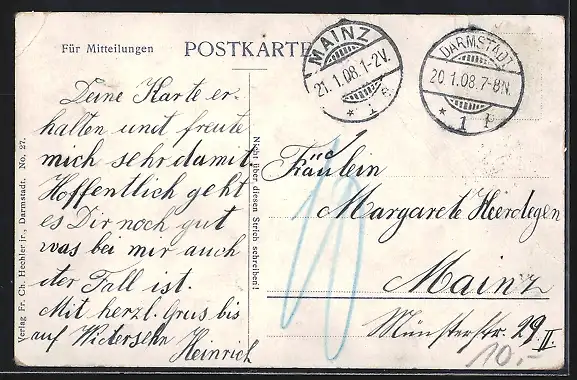 alte Ansichtskarte, gelaufen 1908, Eckknicke oben, Bugspur und Stecknadelloch oben mittig, guter Zustand