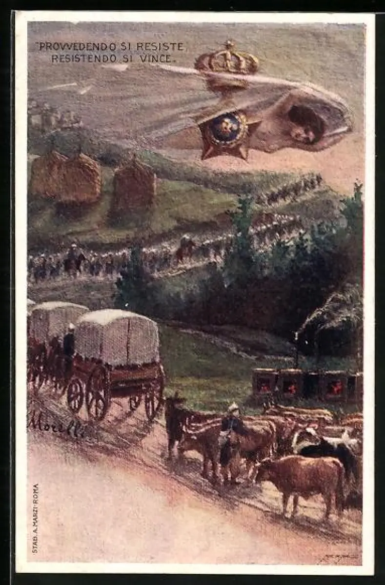 Künstler-AK Soldaten mit Ochsen und Planenwagen auf dem Weg, Provvedendo si resiste, resistendo si vince