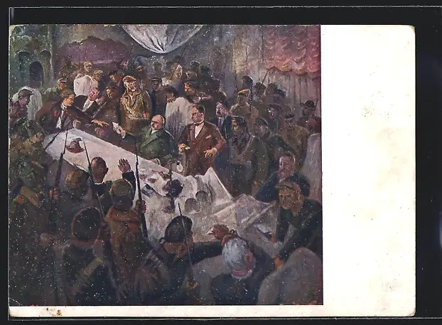Künstler-AK Soldaten und Heerführer versammeln sich zur Besprechung, Revolution 1917