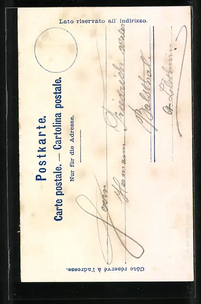 Personenbezogene Daten auf der Rückseite der Karte wurden durch blauen Textmarker unkenntlich gemacht. Die blauen Stellen sind auf die Vorderseite durchgeweicht und wirken sich negativ auf das Postkartenfoto aus