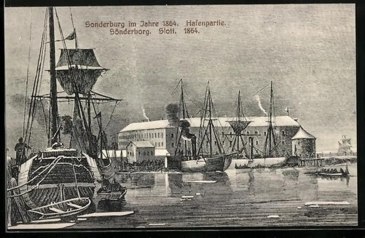 Künstler-AK Sonderburg, Hafenpartie 1864