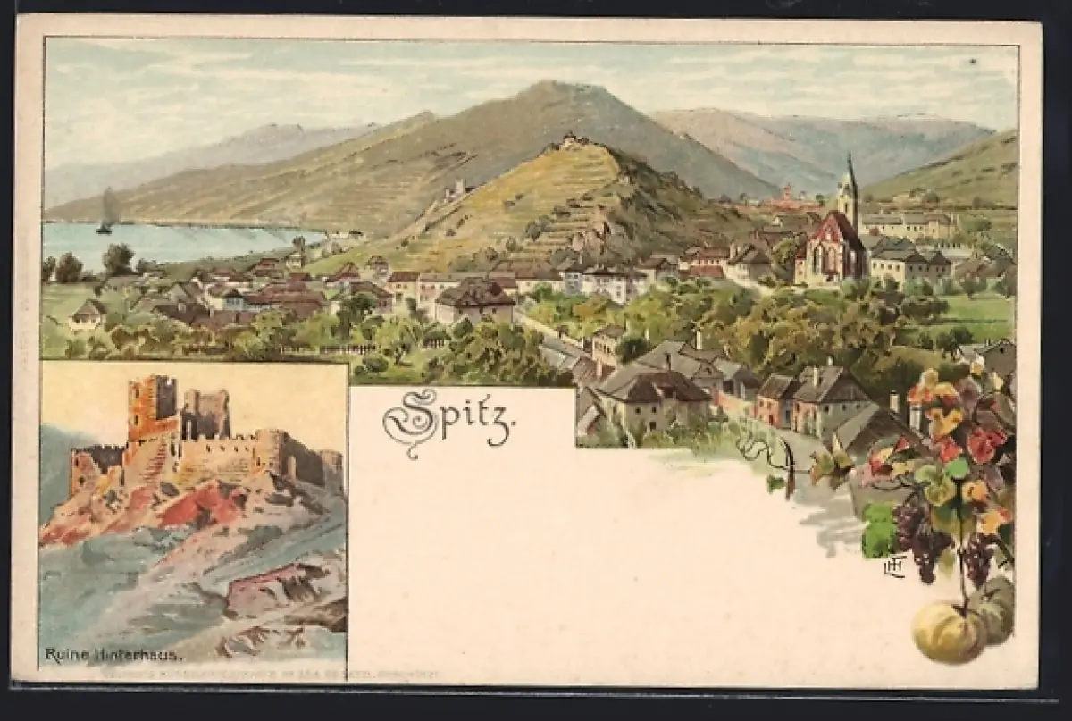 Künstler-AK Spitz, Ortsansicht und Ruine Hinterhaus