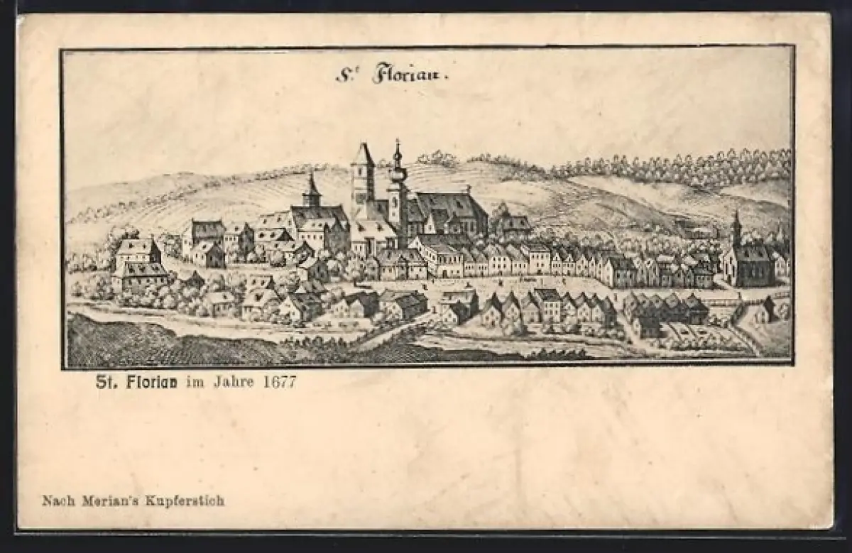 Künstler-AK St. Florian, Ortsansicht im Jahre 1677 nach Merian