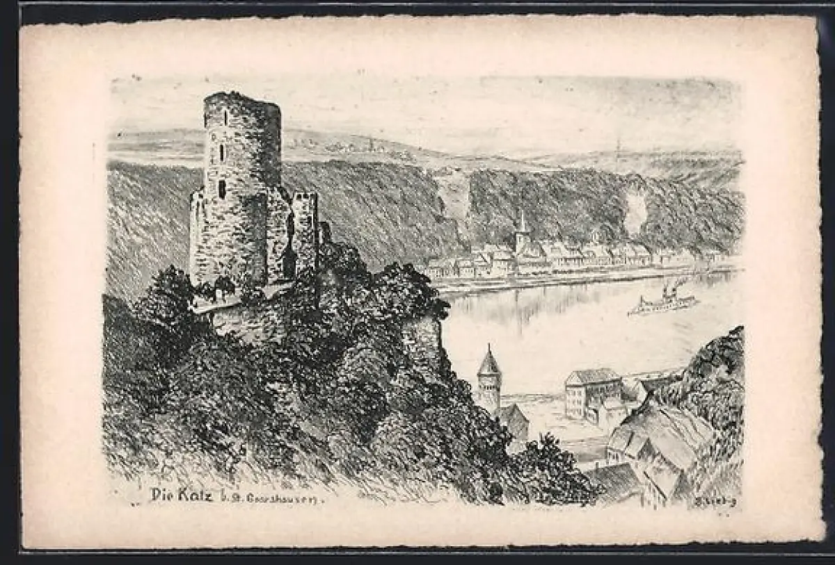 Künstler-AK St. Goarshausen, Burg Katz mit Ortsblick aus der Vogelschau