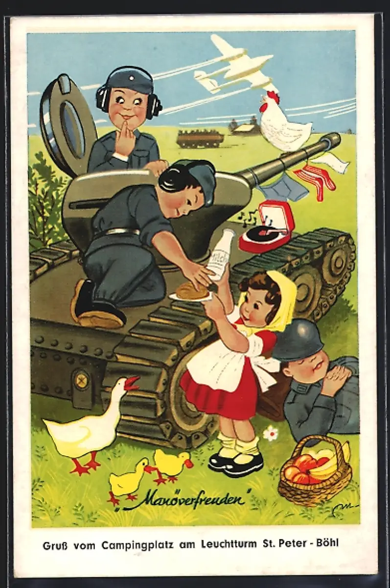 Künstler-AK St. Peter-Böhl, Campingplatz am Leuchtturm, Manöverfreuden