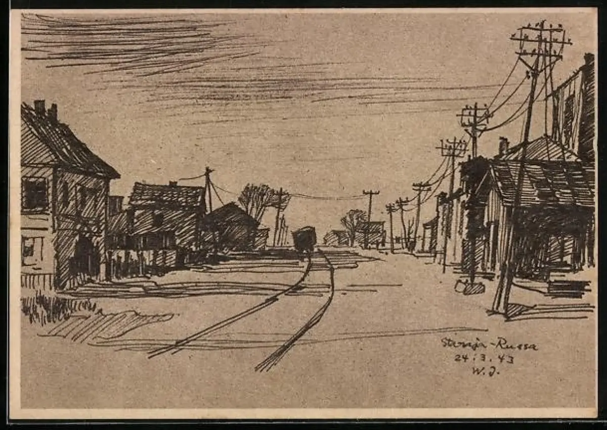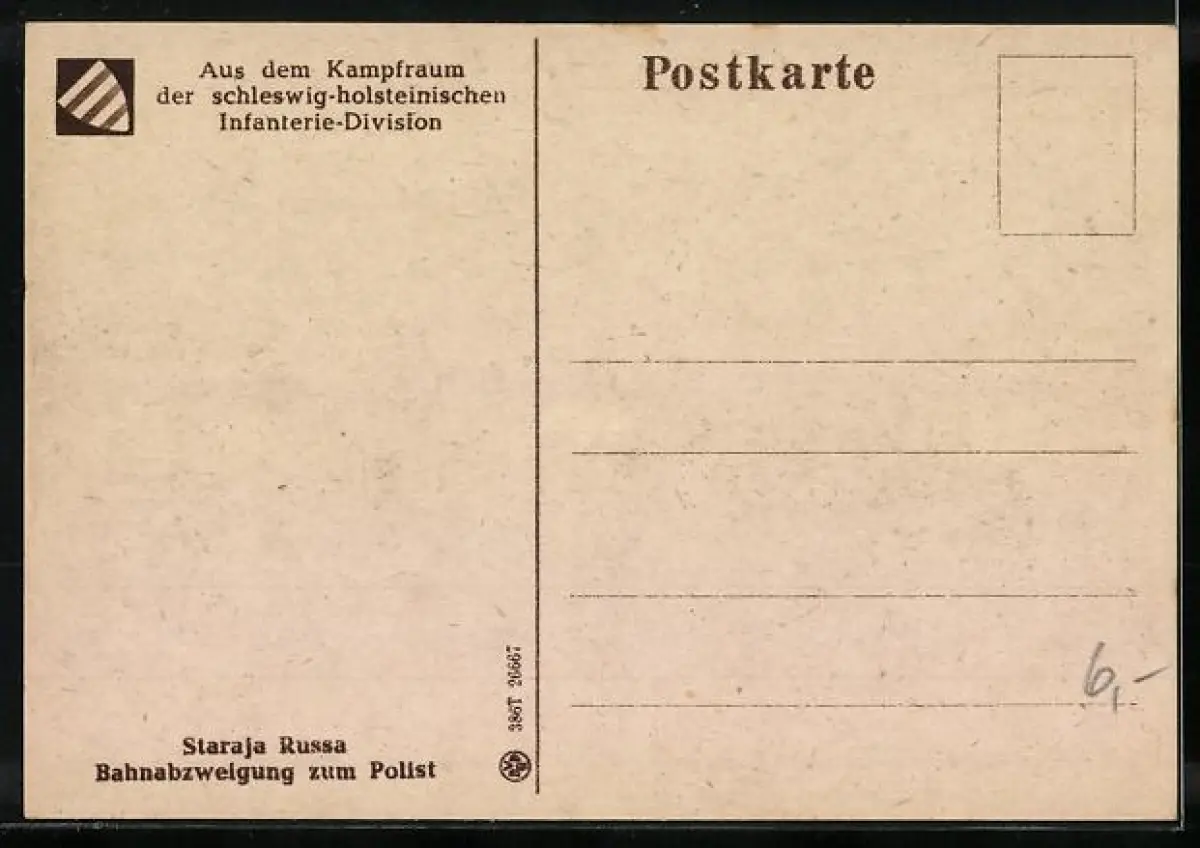 Künstler-AK Staraja Russa, Kampfraum der schleswig-holsteinischen Infanterie-Division, Bahnabzweigung zum Polist