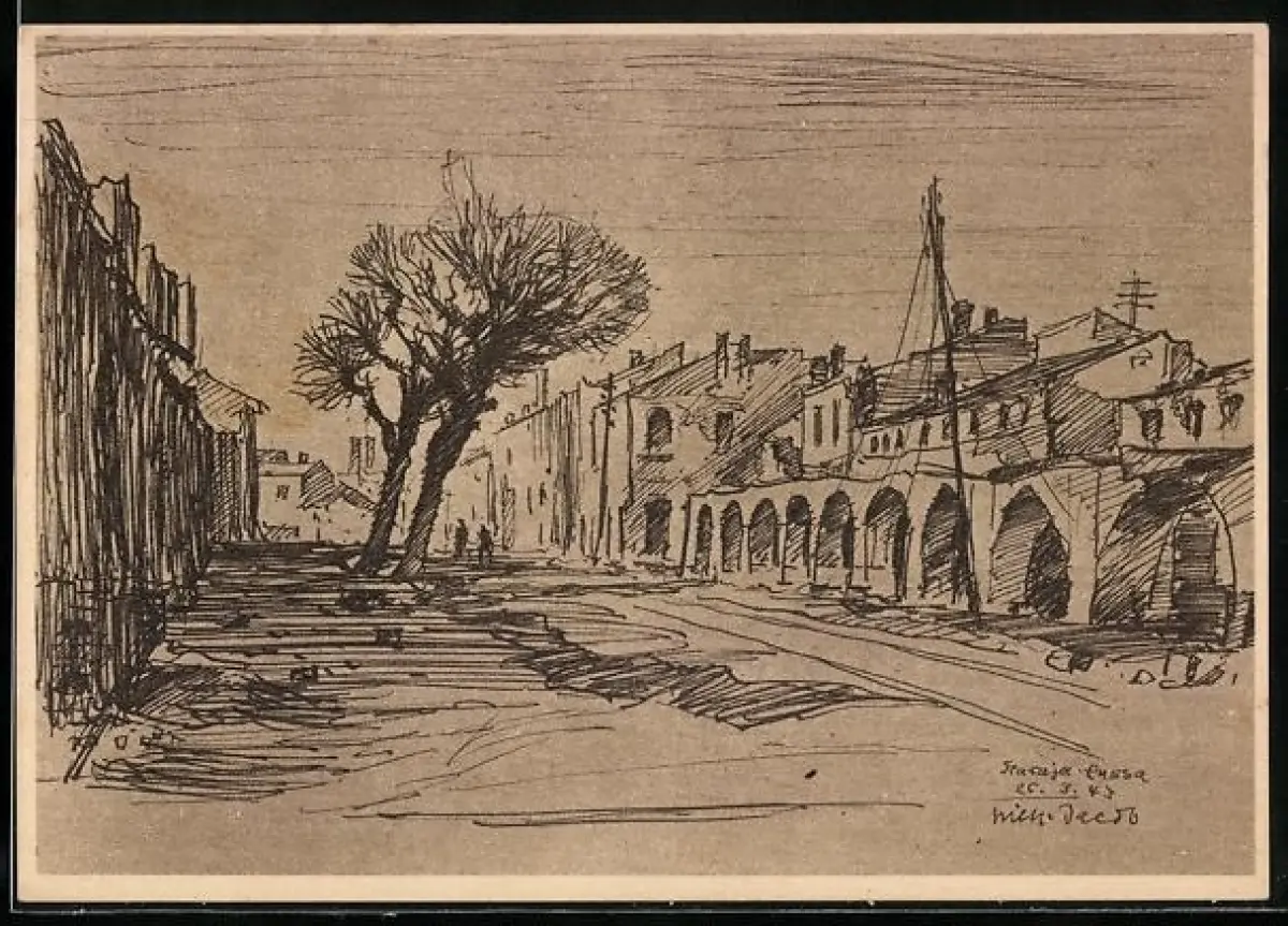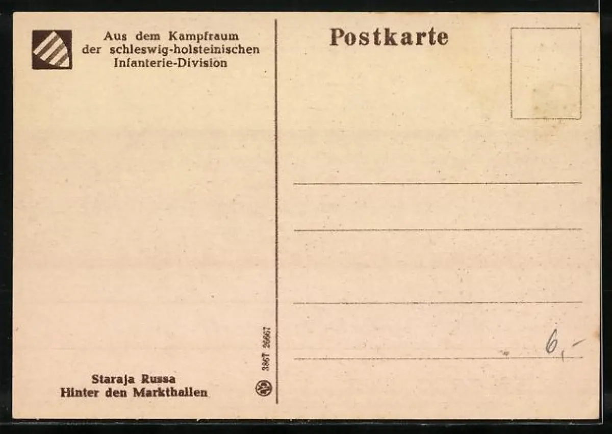 Künstler-AK Staraja Russa, Kampfraum der schleswig-holsteinischen Infanterie-Division, Hinter den Markthallen