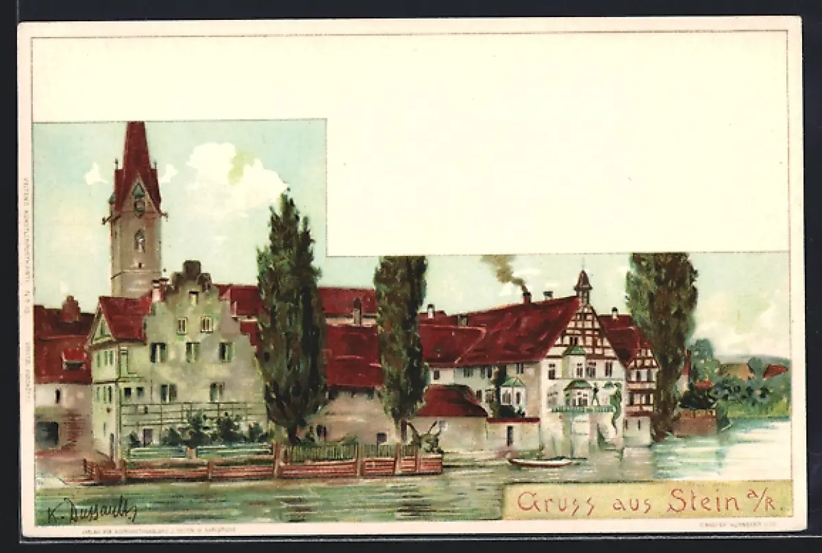Künstler-AK Stein a. Rh., Ortspartie mit Kirche, um 1900