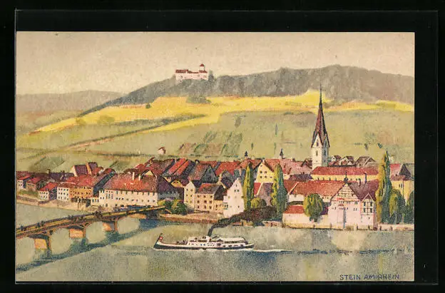 Künstler-AK Stein am Rhein, Totalansicht mit Rheindampfer