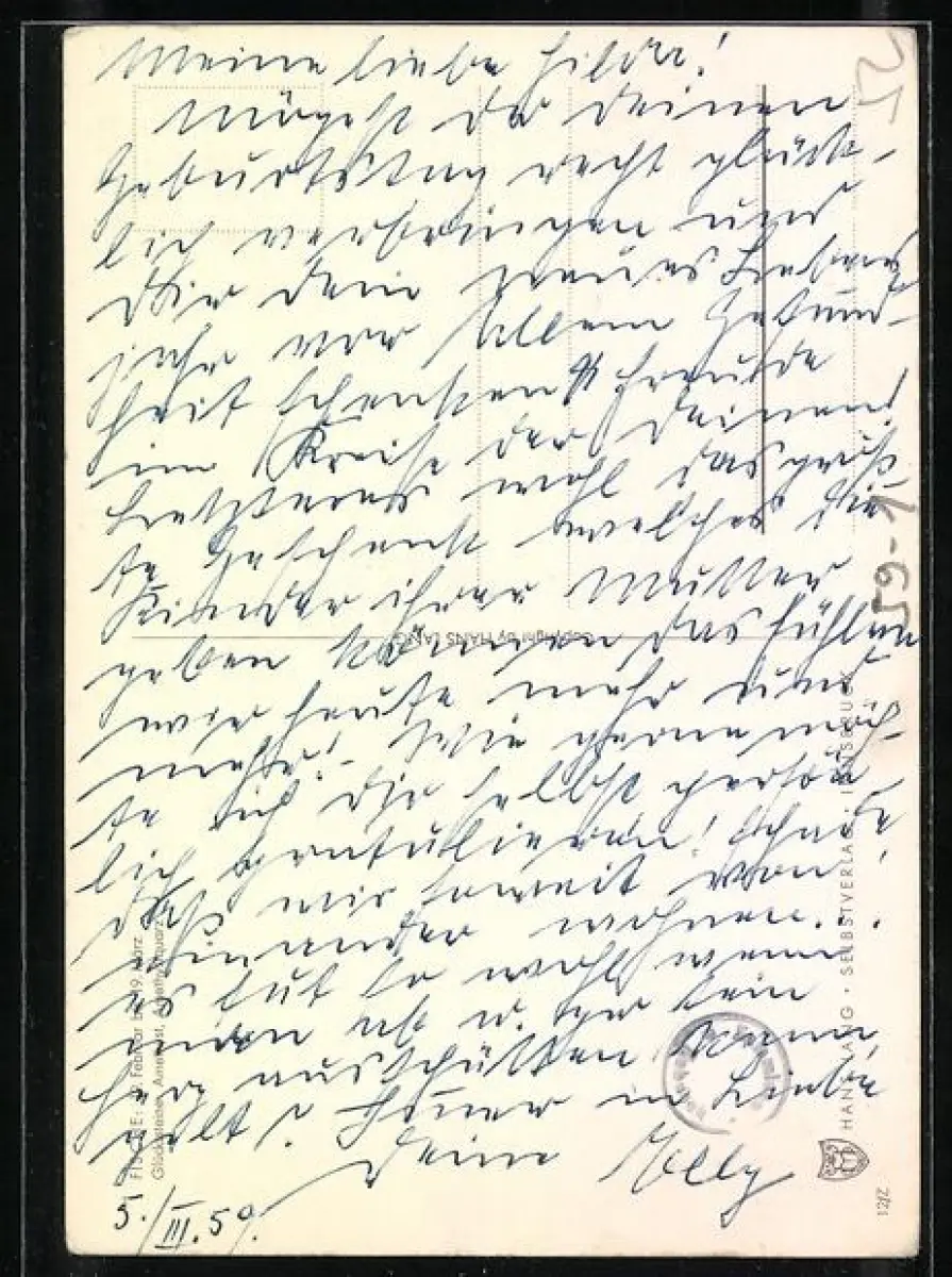 Personenbezogene Daten auf der Rückseite der Karte wurden durch blauen Textmarker unkenntlich gemacht. Die blauen Stellen sind auf die Vorderseite durchgeweicht und wirken sich negativ auf das Postkartenfoto aus