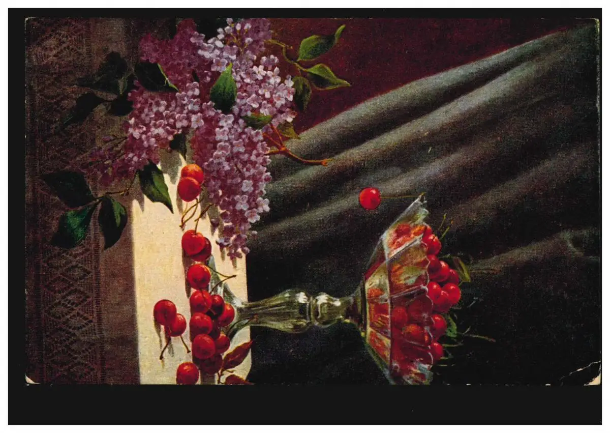 Künstler-AK Stillleben mit Kirschen, Verlag J.S.&.Co.M., per Bahnpost 25.7.1917