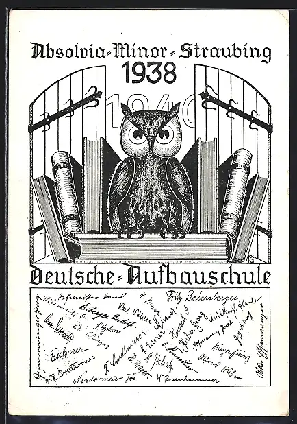Künstler-AK Straubing, Absolvia 1938, Deutsche Aufbauschule, Eule