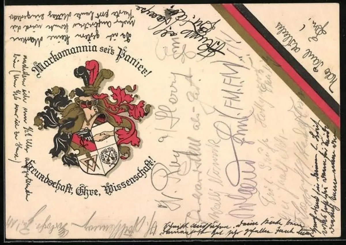 Künstler-AK Studentenwappen in den Farben Schwarz-Rot-Gold, Markomannia sei`s Panier