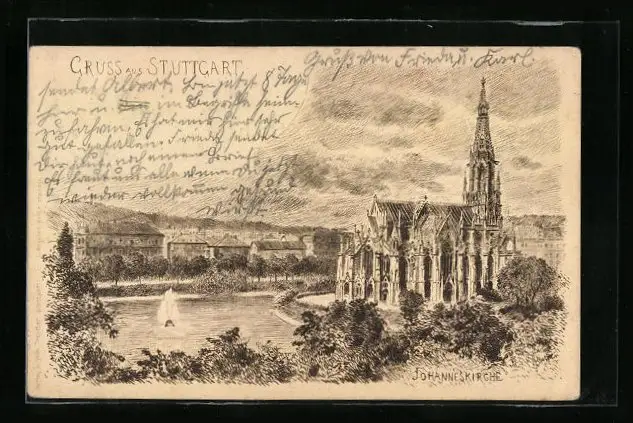 Künstler-AK Stuttgart, Johanneskirche mit Häusern im Hintergrund